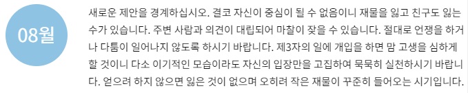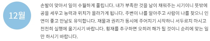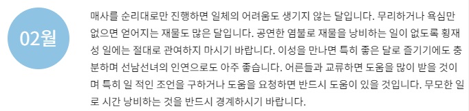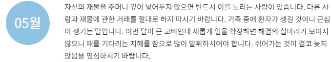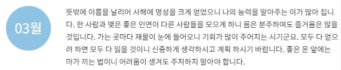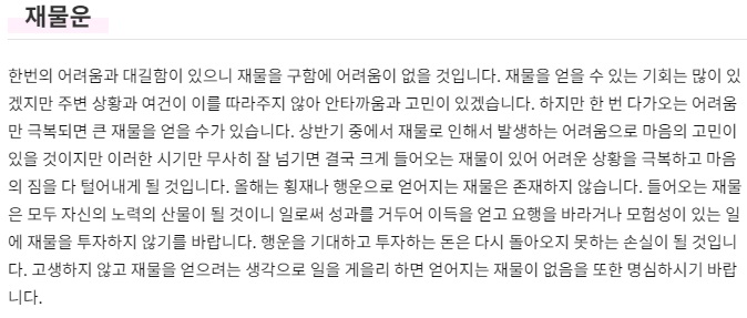 재물이 크게 들어오는 것은 아니지만 작은 것이라도 소중하게 다루고 아끼면 재물이 쌓이게 되니 즐거움 저절로 느껴질 것입니다. 과욕을 부리지 않고 순탄하게 지내면 내가 얻을 수 있는 재물과 뜻밖의 횡재로 재산이 차곡차곡 늘어날 수이니 서둘러 재물을 탐하는 우를 범하지 말아야 할 것입니다. 라는 운세가 나옵니다.