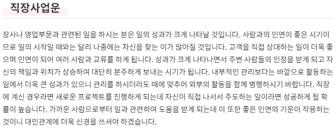 장사나 영업부문과 관련된 일을 하시는 분은 일의 성과가 크게 나타날 것입니다. 사람과의 인연이 좋은 시기이므로 일의 시작일 때와는 달리 나중에는 자신을 찾는 이가 많아질 것입니다. 고객을 직접 상대하는 일이 더욱 좋으며 인연이 되어 여러 사람과 교류를 하게 됩니다.