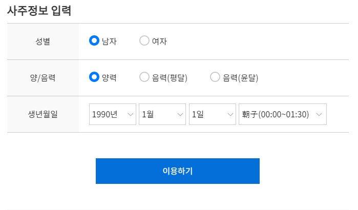 안내드린 농협 사이트에 접속하시어 성별과 양력 음력 구분, 생년월일 및 태어난 시간을 입력하시면 됩니다.