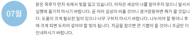 마른 샘에 비가 내리는 형국입니다. 비로소 막혔던 일이 풀리고 시원함을 느끼게 되는 달입니다. 문제가 되었던 것은 해결의 실마리가 보이는 시기입니다.