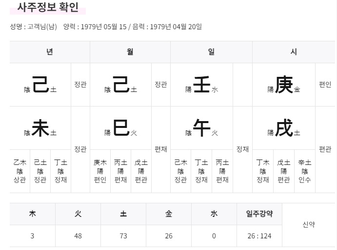 1979년 양띠의 운세를 보았습니다. 편인, 평관, 등의 정보가 나오고 일주강약에 따른 기운까지 나옵니다.