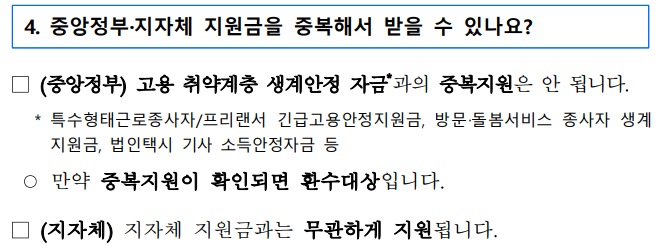 답변은 (중앙정부) 고용 취약계층 생계안정 자금*과의 중복지원은 안 됩니다.