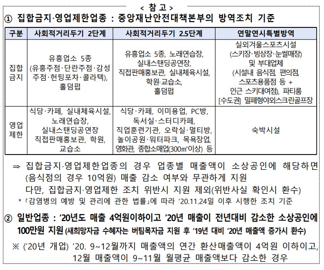 버팀목자금은 소상공인여부가 제일 중요하며, 집합금지업종과 영업제한업종은 매출액감소와 없이 무관하게 지원금액이 있습니다.