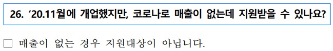 질문 2020년 11월에 개업했지만 바로 집합금지, 영업제한에 걸려 매출이 없는데 지원받을 수 있나요?