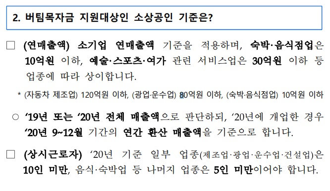 질문버팀목자금 지원대상 소상공인 기준은 어떻게 되나요?